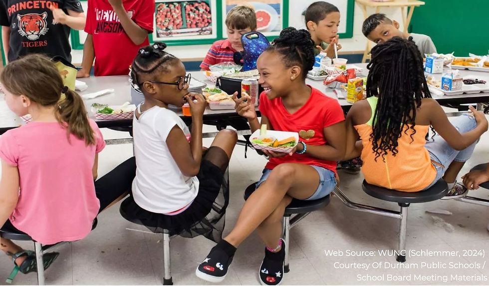 One of those organizations in North Carolina is DPS Nutrition Services. DPS is committed to providing nutritious meals to students in the district, preparing most of its food from scratch, sourcing it regionally, and ensuring meals are culturally appropriate. Students benefit from free breakfast and lunch, designed to support their well-being and academic performance (see image). Community members may support DPS through donations, advocating for policy, and by participating in monthly meetings hosted by Ms. Thayer.